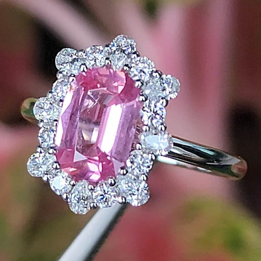 18K White Gold Ring with GIA Tanzanian Unheated Pink Spinel and White Round and Pearshape Diamonds